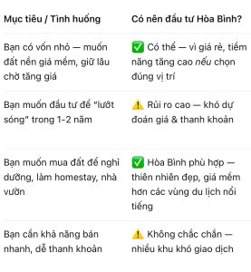 🎯 Khi nào nên / không nên đầu tư đất ven Hòa Bình — tùy mục tiêu của bạn