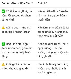 - Hòa Bình cũng được đánh giá có tiềm năng phát triển: theo phân tích của một số công ty và chuyên gia, với quỹ đất rộng, cảnh quan thiên nhiên, tiềm năng du lịch + sinh thái + hạ tầng phát triển — Hòa Bình phù hợp cho đầu tư dài hạn, nghỉ dưỡng hoặc đất nền chờ tăng giá.